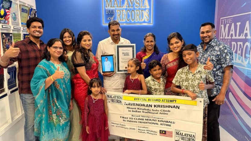 Reaching the summit of Mount Kinabalu is an achievement many hikers dream of. For Navendran, however, the journey carried a deeper meaning. On 23 February 2026, he successfully climbed the iconic mountain while wearing Indian traditional attire, earning recognition from the Malaysia Book of Records as the first person to accomplish this unique feat.