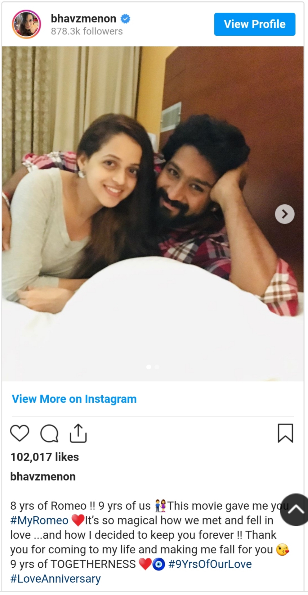 Actress Bhavana is celebrating the 9th year anniversary of togetherness with her husband film producer Naveen.