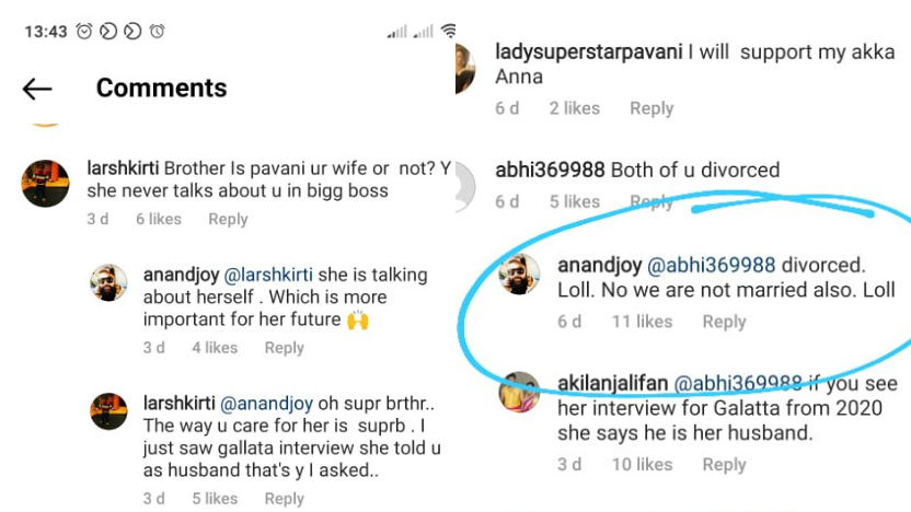 When one of the netizens questioned Anand if they are divorced, he simply replied 'we are not married also'. Another netizen asked why Pavani is not talking about Anand in the show and here's what he commented: 'She is talking about herself. Which is more important for her future.'