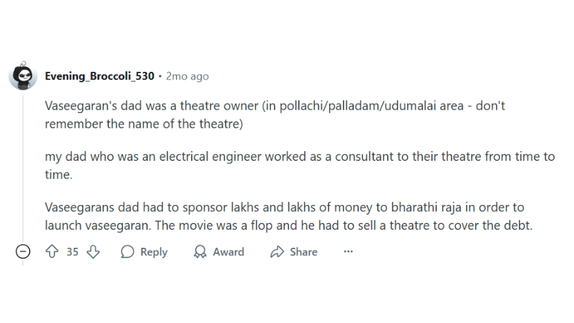 Hailing from Palladam, Vaseegaran was the son of a theatre owner in the Pollachi-Palladam-Udumalaipettai region. His entry into cinema was no ordinary tale. It's said that his father, deeply invested in his son's dream, reportedly funded crores of rupees into director Bharathiraja’s production to launch him. Unfortunately, Kangalal Kaidhu Sei did not meet commercial expectations, and the financial strain forced his family to sell off one of their theatres.