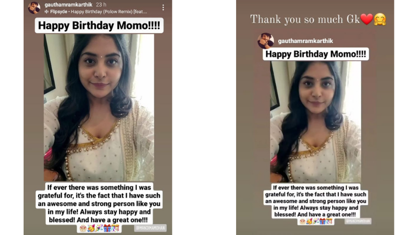 Gautham's recent loving wishes to Manjima on her birthday may be a clear indication of his feelings for Manjima.