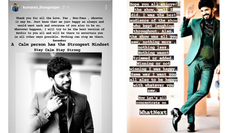 Following the telecast of the show, Kumaran has shared an emotional note thanking everyone and promising that he will try to be the best version of Kathir. He also added that he enjoyed the award show as a member of the audience, regardless of whether he won an award or not. Take a look at his Instagram stories here:
