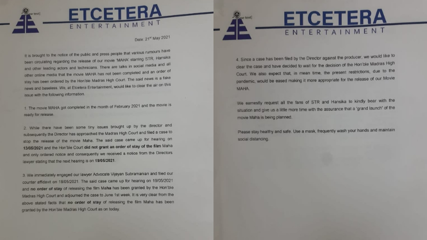 Despite wrapping up the shoot in February 2021, the film's release date hasn't been finalised. Recently, it was rumored that the Madras High Court has ordered a stay on the release of Maha. However, the film's producer Mathiyazhagan addressed the rumor by releasing a statement.