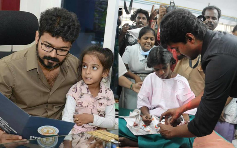 Vijay launched his social welfare organisation 'Vijay Makkal Iyakkam' in 2009. Besides organising relief camps, he also helps the poor and needy, and funds the education of poor students.