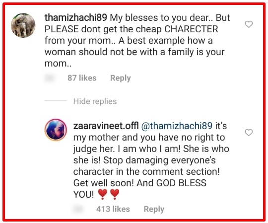A few comments targetted Archana as well and Zaara didn't go easy on them. Defending her mother, Zaara replied, "It’s my mother and you have no right to judge her. I am who I am! She is who she is! Stop damaging everyone’s character in the comment section! Get well soon! And GOD BLESS YOU!"