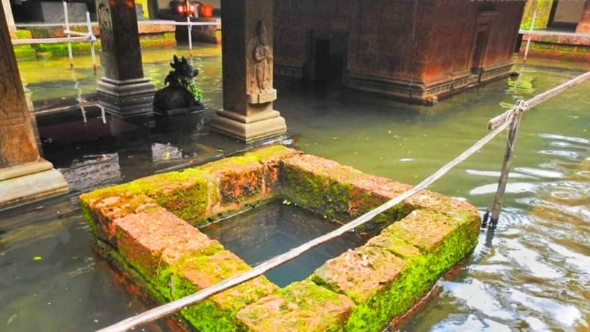The sanctum of the temple is unlike any other. The Shivalingam here is swayambhu (self-manifested), formed by the fusion of two granite stones symbolizing the male and female principles of divinity. What adds to its wonder is that the sanctum sanctorum, namaskara mandapam, and pradakshina patha (circumambulatory path) are always filled with water.