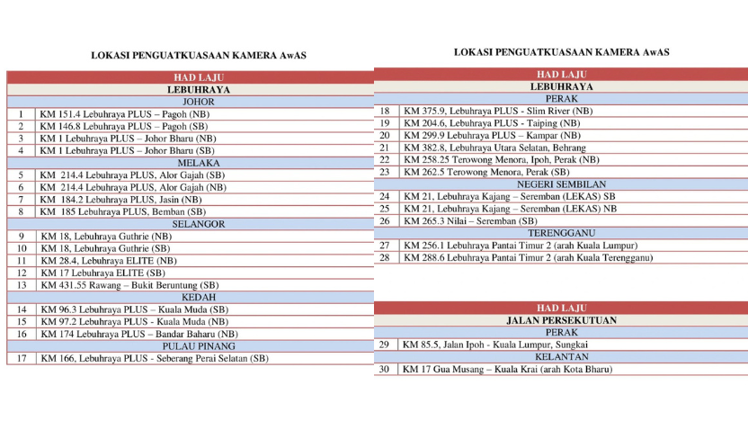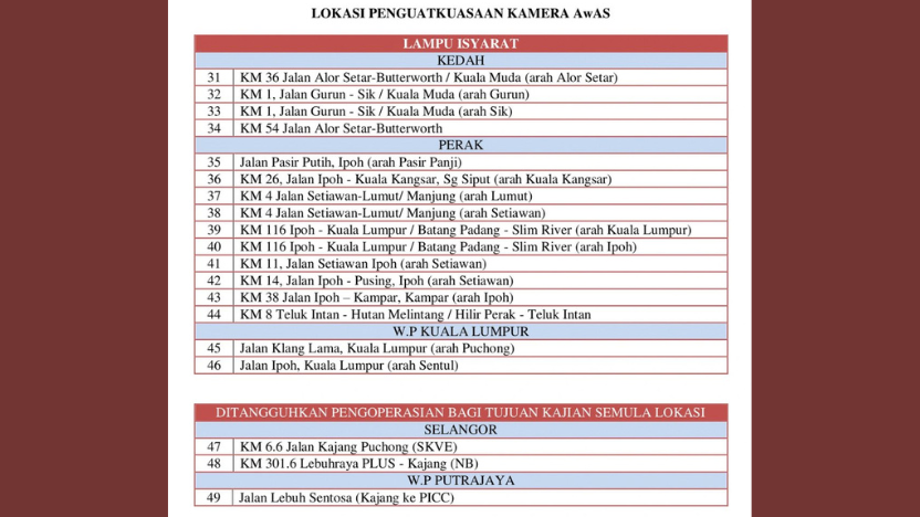 JPJ has released a list of current AwAS camera locations, which is provided in the attachment below. Please note that this list may change as updates are made periodically.