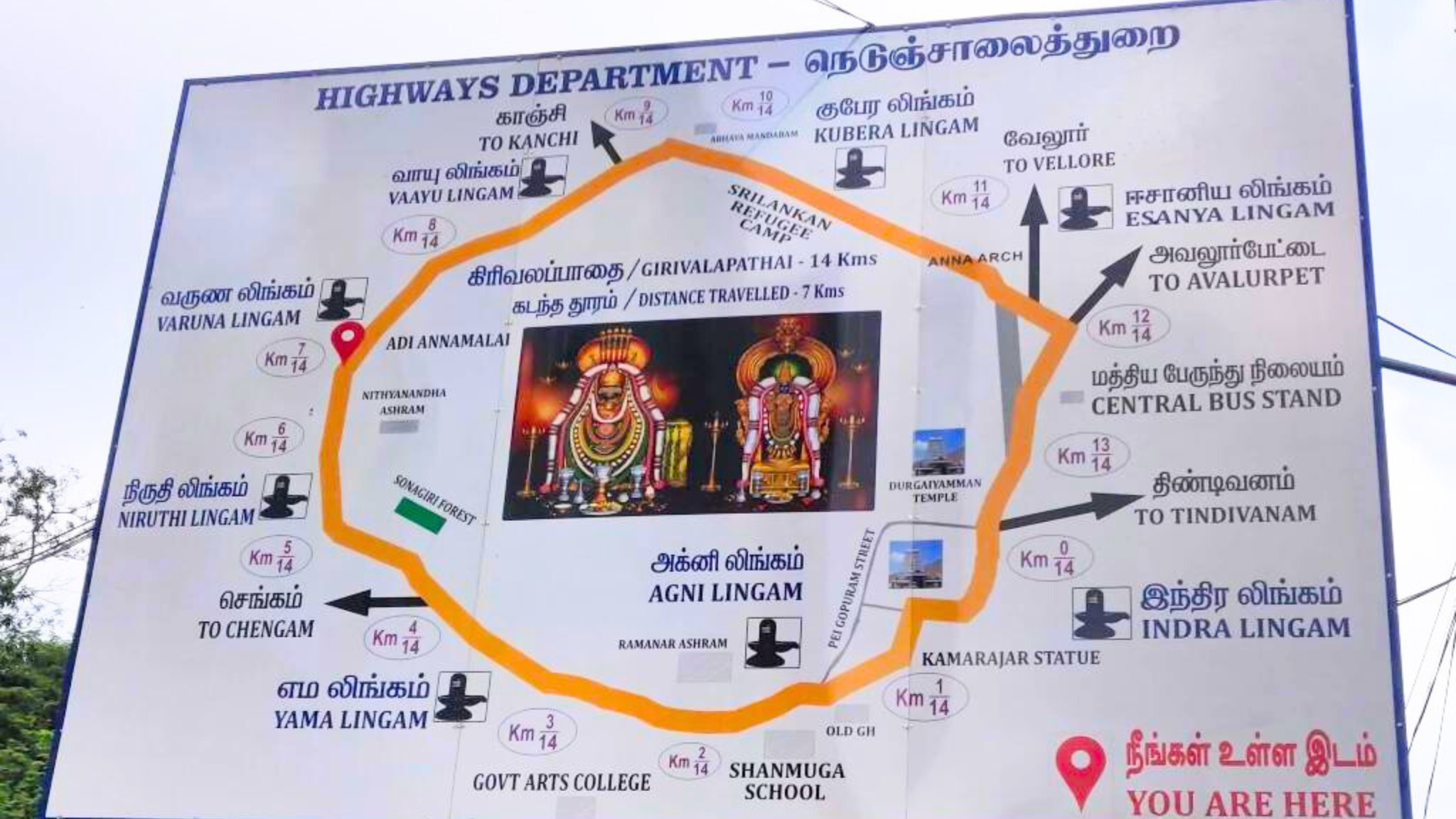 Girivalam, also known as Giripradakshina, refers to the circumambulation of Arunachala, a holy mountain in Southern India. Thousands, sometimes hundreds of thousands, of pilgrims from around India and the world come to Tiruvannamalai each month to complete this 14-kilometer circuit. Traditionally, Girivalam is performed slowly and without shoes, keeping the hill to one’s right side. According to scriptures, it is best to undertake this journey freshly bathed, dressed in white, and with focus on Shiva in the form of Arunachaleshwarar, the lord of the mountain.