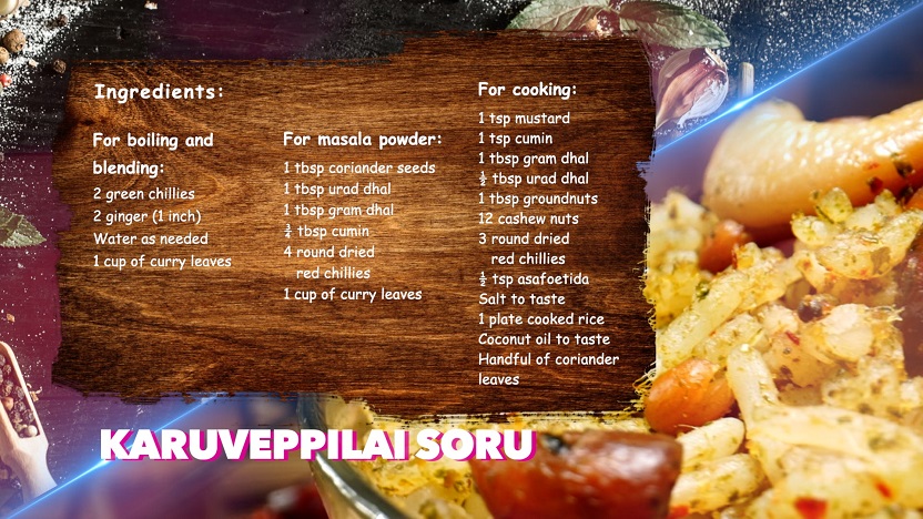 - To prepare the Karuveppilai paste, boil 2 green chilies, 2 ginger (1 inch), and 1 cup of curry leaves