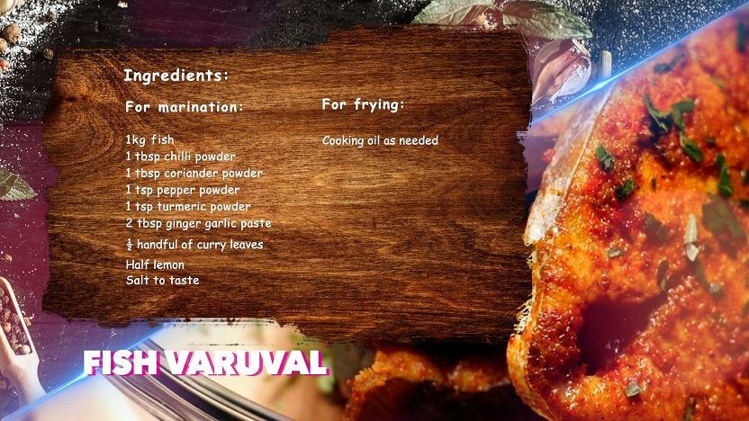 - Marinate the fish with 1 tbsp chili powder, 1 tbsp coriander powder, 1 tsp pepper powder, 1 tsp turmeric powder, 2 tbsp ginger garlic paste, ½ handful of curry leaves then squeeze half lemon and add salt; Keep it aside for 30 minutes.