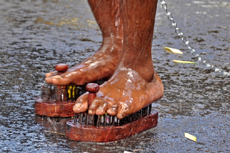 Some of the spectacular parts of the celebration include fire-walking, walking on the top of the sword and bearing Kavadis. The kavadi is associated with the Tamil legend and story of Idumban, a reformed bandit and a disciple of Agasthiyar. Idumban was asked by his guru to fetch two mountain peaks and attach them to the ends of a kavadi, which is a pole used to carry loads.