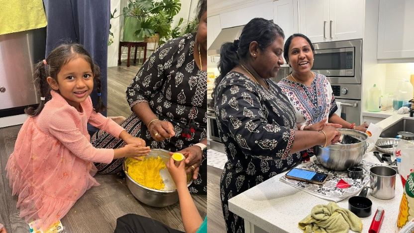 Two years ago, she visited Kuala Lumpur with her one-year-old daughter. She celebrated with her entire family members. Together, they prayed, changed into new clothes, lit sparklers, and shared food and palagarams. That memory made her miss home even more when she returned to Canada.