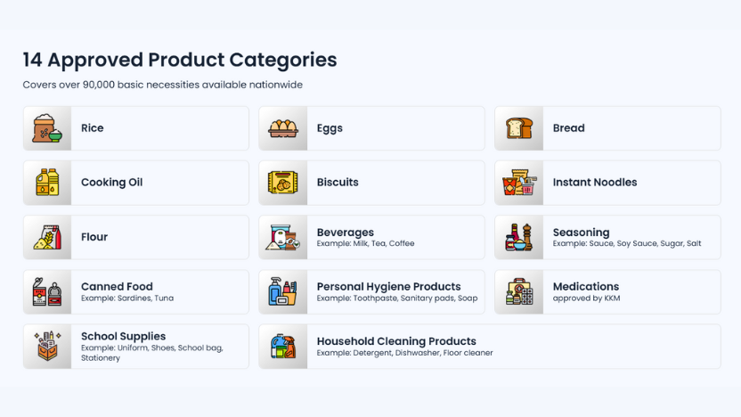 Select items with the SARA/MyKasih label from 14 approved categories.