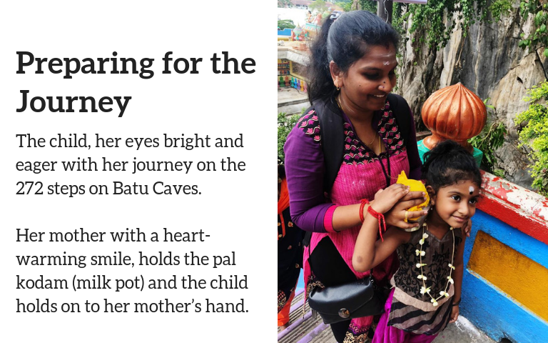 Thaipusam is a spectacular sight, colourful and cheerful and filled with love. This picture speaks of all the above, a young mother leading her child on her pal kodam (milk pot) journey.