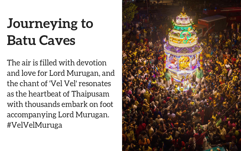 Lord Murugan begins His journey, the Lord rides on His silver chariot towards the Batu Caves Sri Subramaniar Swamy Temple. Surrounded by devotees and ambiance filled with colourful flowers, scents of incense and music, the Lord is seen in His full glory.