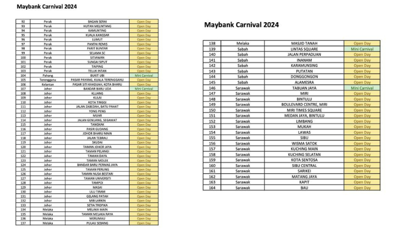 According to an official notice from Maybank, these selected branches will be open as part of the Maybank Carnival, offering customers a range of banking services. These include opening bank accounts, setting up ASB accounts, applying for credit cards, and enjoying exclusive promotions available on the day.