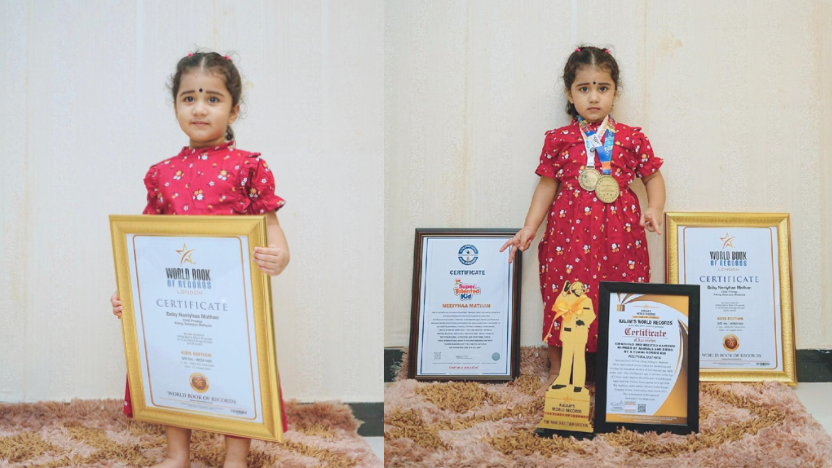 By the age of 2 years and 4 months, Neeiyhaa could effortlessly recite the names of alphabets, numbers, phonics, rhymes, animals, vegetables, fruits, flowers, months of the year, days of the week, shapes, seasons, opposites, feelings, body parts, objects, 10 Thirukkural, Aathichudi, and devotional songs. This astonishing range of knowledge earned her another prestigious recognition.