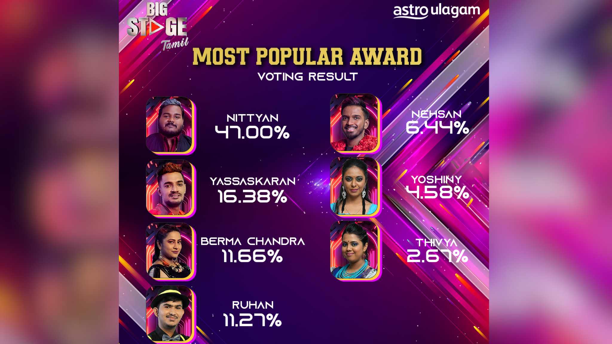 The votes are in. Check out the voting results for the Most Popular Contestant Award at Big Stage Tamil S2!