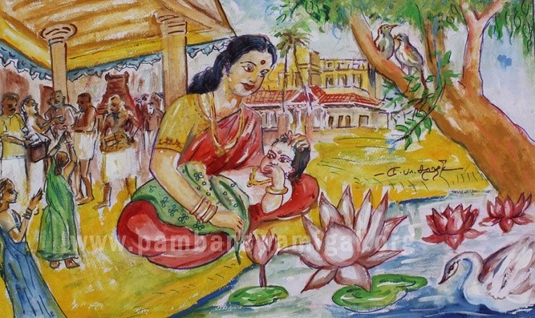 His wife told him that after her prayer to Lord Murugan, a saintly figure came inside the house and applied vibhuti on the child and went away. From that moment, the child was cured. Pamban Swami knew it was Lord Murugan himself who came.