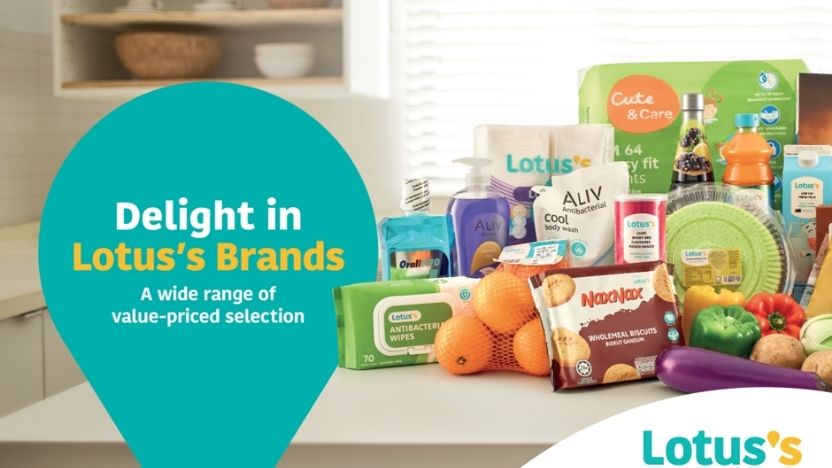 Lotus's own brand products, such as the UHT chocolate milk, potato chips, fries, nuggets, frozen pizza, and Cute and Care baby diapers are some of the brands well-liked by customers.