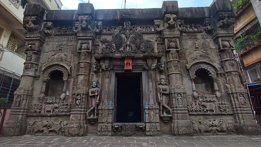 Constructed entirely of Deccan basalt stone, the temple features a rectangular plan with a facade reminiscent of ancient rock-cut cave temples. Its architecture reflects a harmonious blend of Rajasthani, Malwa, South Indian, and Maratha influences. The richly detailed sculptures adorning the temple walls depict animals such as elephants and chained rhinoceroses, mythical beings, guardian deities, and dramatic battle scenes. Among these carvings is a rare historical panel portraying the aftermath of the Battle of Plassey in 1757, featuring a British soldier and a chained rhinoceros, an extraordinary intersection of history and sacred art.
