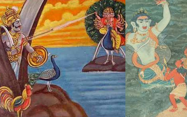 A fierce battle was fought between Veerabahu, commander-in-chief of Lord Kartikeya’s army and Tarakasura. As time went by, Tarakasura’s army began losing. The demon resorted to using magic to trap Veerabahu in the Krauncha mountain. Knowing this, Sage Narada quickly made his way and told Lord Kartikeya what happened.