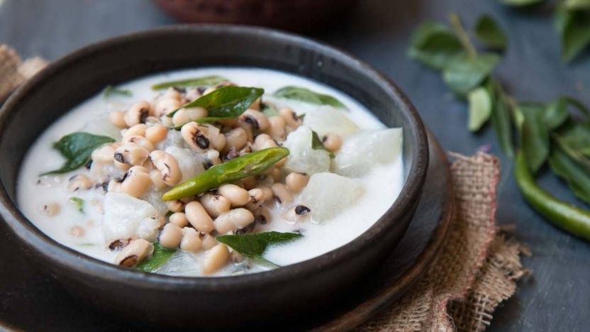 This is a delicious stew made with ash gourd (white pumpkin), cowpeas, coconut milk, coconut oil, and fresh curry leaves. It goes best with pumpkin and black-eyed beans with steamed rice, or potato roast for a wholesome lunch or dinner.