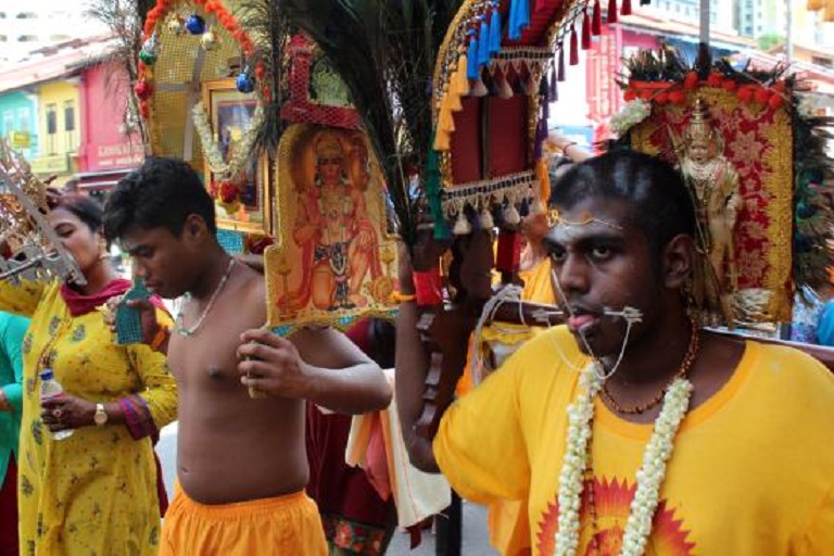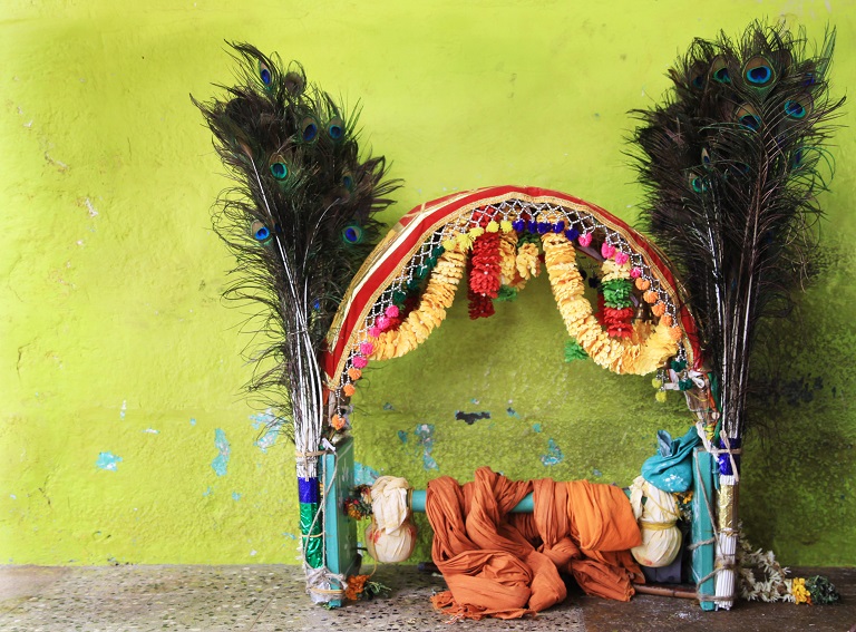 The usual Kavadi is a small wooden structure with an arch covered with a piece of cloth and is held on shoulders. The two sides of the Kavadi are covered with feathers of a peacock – the vehicle of Lord Murugan. The sides also contain milk pots or two bags to carry offerings to the Lord. Some devotees seek contributions from different households by 'begging' (a religious practice in Hinduism) to collect offerings to the Lord. But today, most people fill the bags on their own.