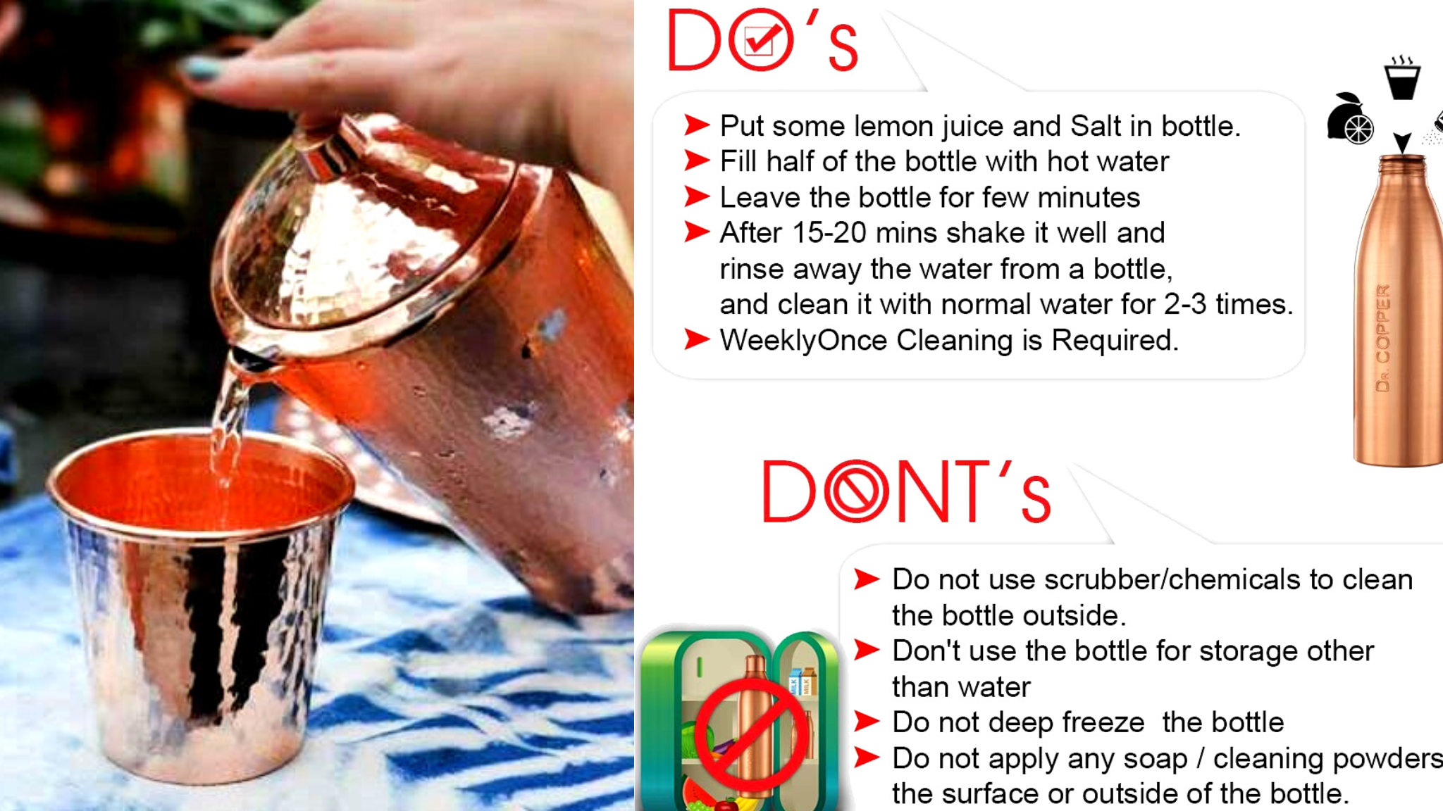 In terms of how much water to drink from a copper bottle, there's no set amount recommended. As usual, adults are recommended to drink at least 8-8.5 cups (2-2.5 liters) of water per day, regardless of the type of container it is consumed from.