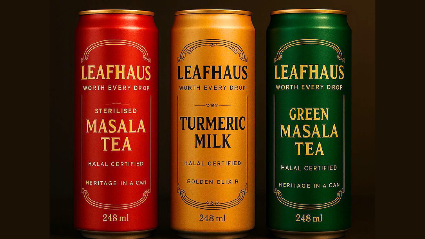 Leafhaus Masala Tea in a Can and Turmeric Milk in a Can, proudly Malaysian products created with traditional spices and sterilized milk, fully halal-certified and shelf-stable.