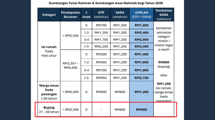 The STR 2026 payment rate and phases will depend on each applicant’s category. Although singles will no longer receive cash assistance, they will still benefit from the RM600 yearly SARA credit.